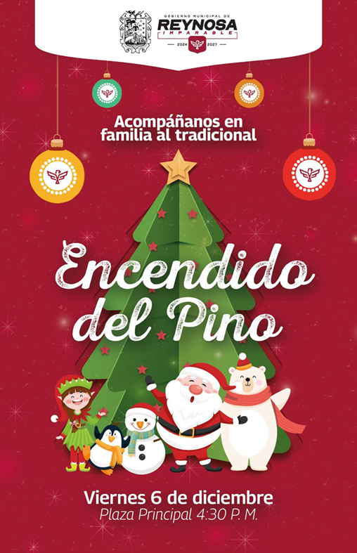 La magia de la Navidad iluminará la ciudad, el Presidente Municipal Carlos Peña Ortiz esta invitando a todas las familias de Reynosa al Tradicional Encendido del Pino, este viernes 6 de diciembre a las 4:30 de la tarde en la plaza principal Miguel Hidalgo.